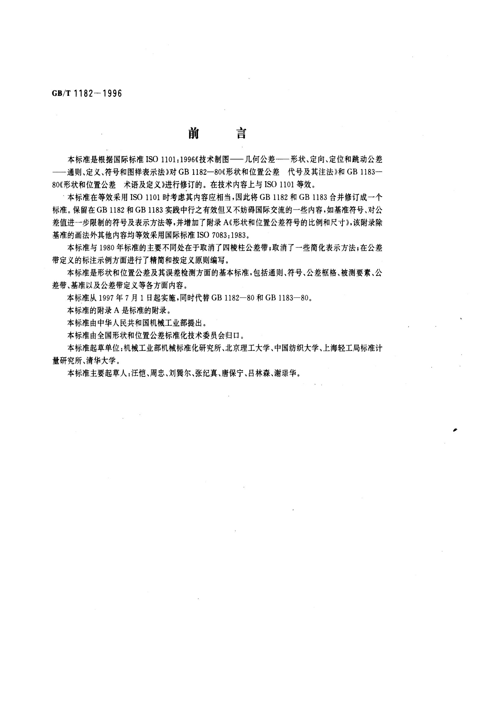 本標(biāo)準(zhǔn)是根據(jù)國際標(biāo)準(zhǔn)ISO 1101:1996《技術(shù)制圖一幾何公差一- 形狀、 定向、定位和跳動公差通則、定義、符號和圖樣表示法》對GB 1182- - -80《形狀和位置公差代號及其注法》和GB 1183-...